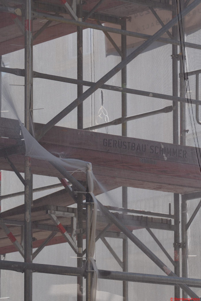 23.8.2019, 13:07 Uhr, Frankfurt: Auf der Throner Straße kann ich mal wieder nicht an einem Gerüst vorbei, das mir schon öfter aufgefallen ist, weil es so schön in der Sonne schimmert.