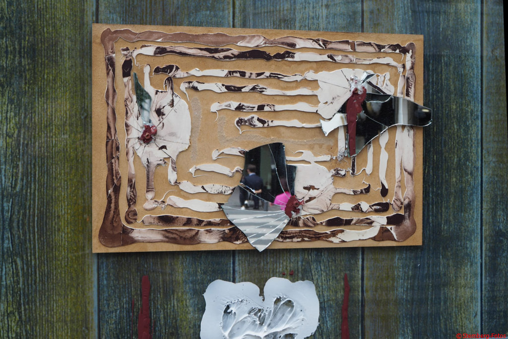 5.9.2019, 13:45 Uhr, Frankfurt: Es sollte regnen, hat es aber nicht. Am Rossmarkt sehe ich dieses schöne Straßenkunststück, das ich etwas schief fotografieren muss, um nicht selbst im Spiegel zu landen.