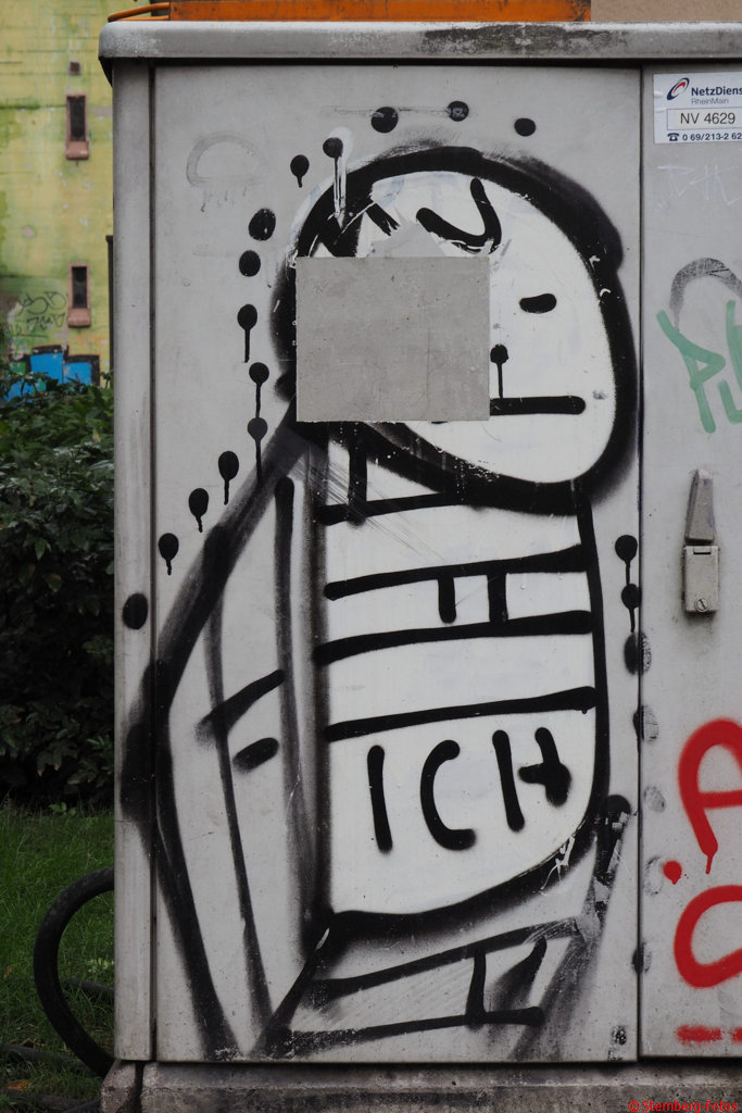 10.10.2019, 11:33 Uhr, Frankfurt: Nachmittags wird es schön, aber da bin ich schon zurück vom Bauernmarkt. Auf dem Weg dahin hatte ich dieses Bild in der Freiligrathstraße gefunden. Das bin natürlich nicht ich.