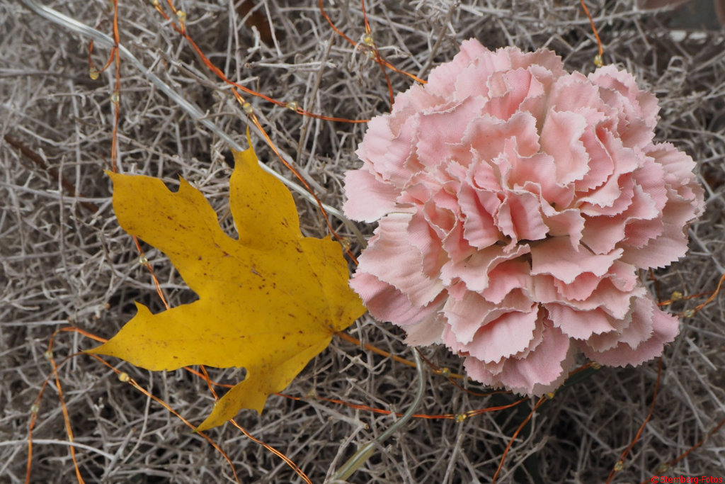 28.11.2019, 13:09 Uhr, Frankfurt: Damit ich mal raus komme, gehe ich zum Bauernmarkt. Auf dem Rückweg sehe ich, dass sich ein Blatt in der Deko eines Geschäfts an der Bergerstraße verirrt hat.