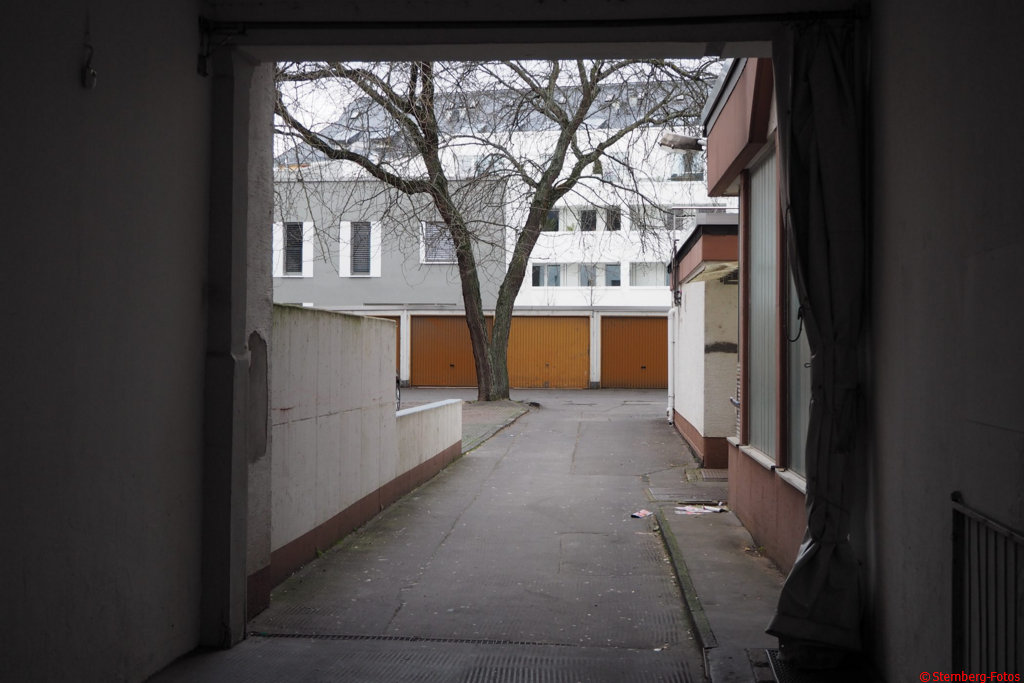 9.2.2020, 14:08 Uhr, Frankfurt: Diese schöne Trostlosigkeit finde ich in der Einfahrt in Bornheim Mitte, wo wochentags immer der Gemüsestand steht.