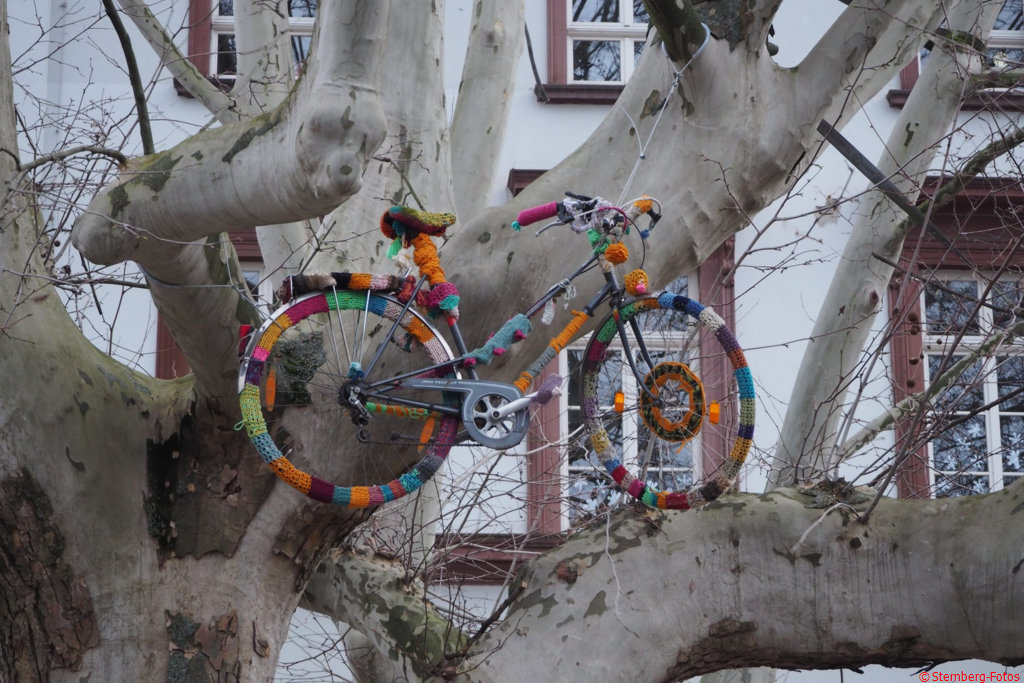 23.2.2020, 17:12 Uhr, Frankfurt: Am späten Nachmittag gehe ich kurz raus. Damit ich in Bewegung komme, mache ich einen kleinen Umweg. Als ich schon nicht mehr an ein gutes Motiv glaube, finde ich dieses Fahrrad im Baum der Kirchner-Schule.